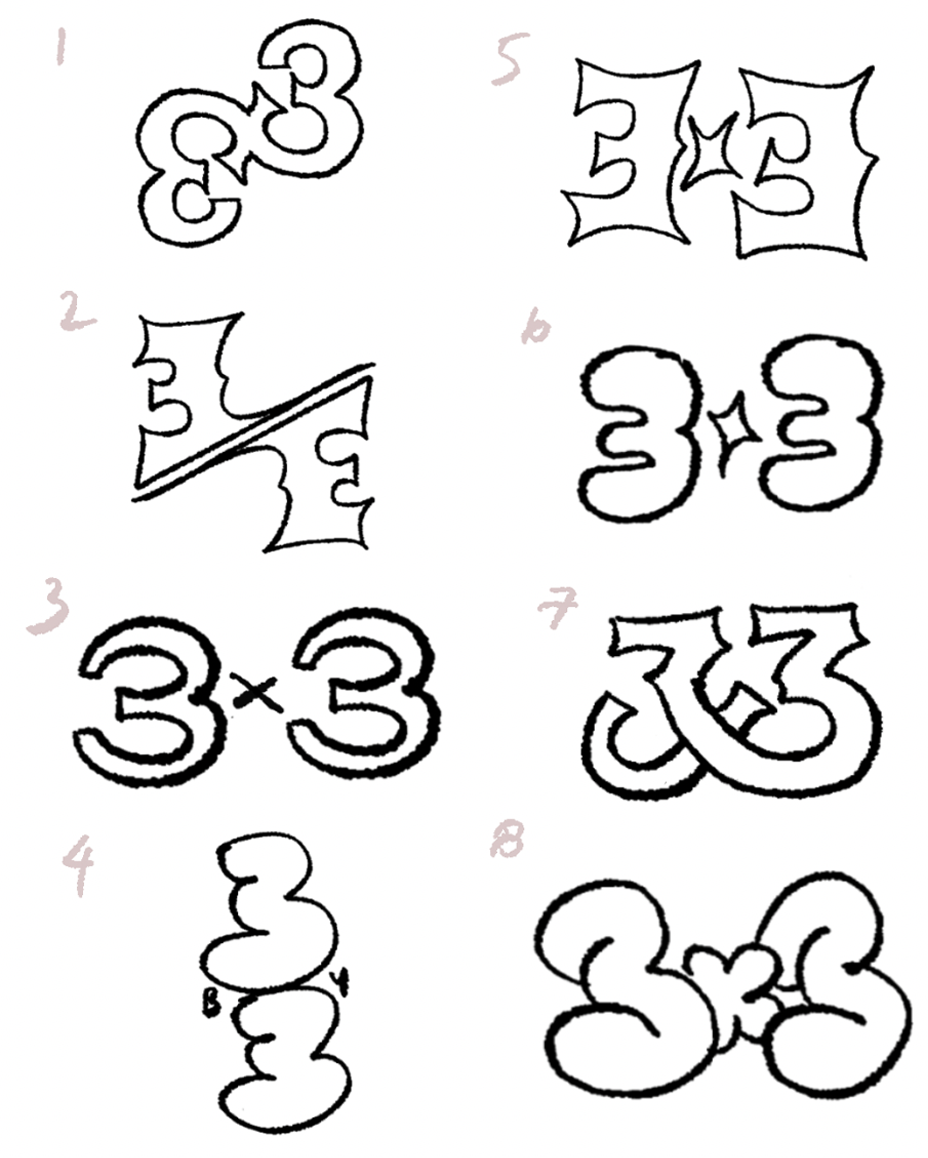 I created several versions, aiming for the 3 to be prominent and easily recognizable while integrating it in a unique way. I wanted to maintain a doodle-like, cartoonish appearance, but avoided making it too bubbly, as that style felt overused. My goal was to achieve a more original look.