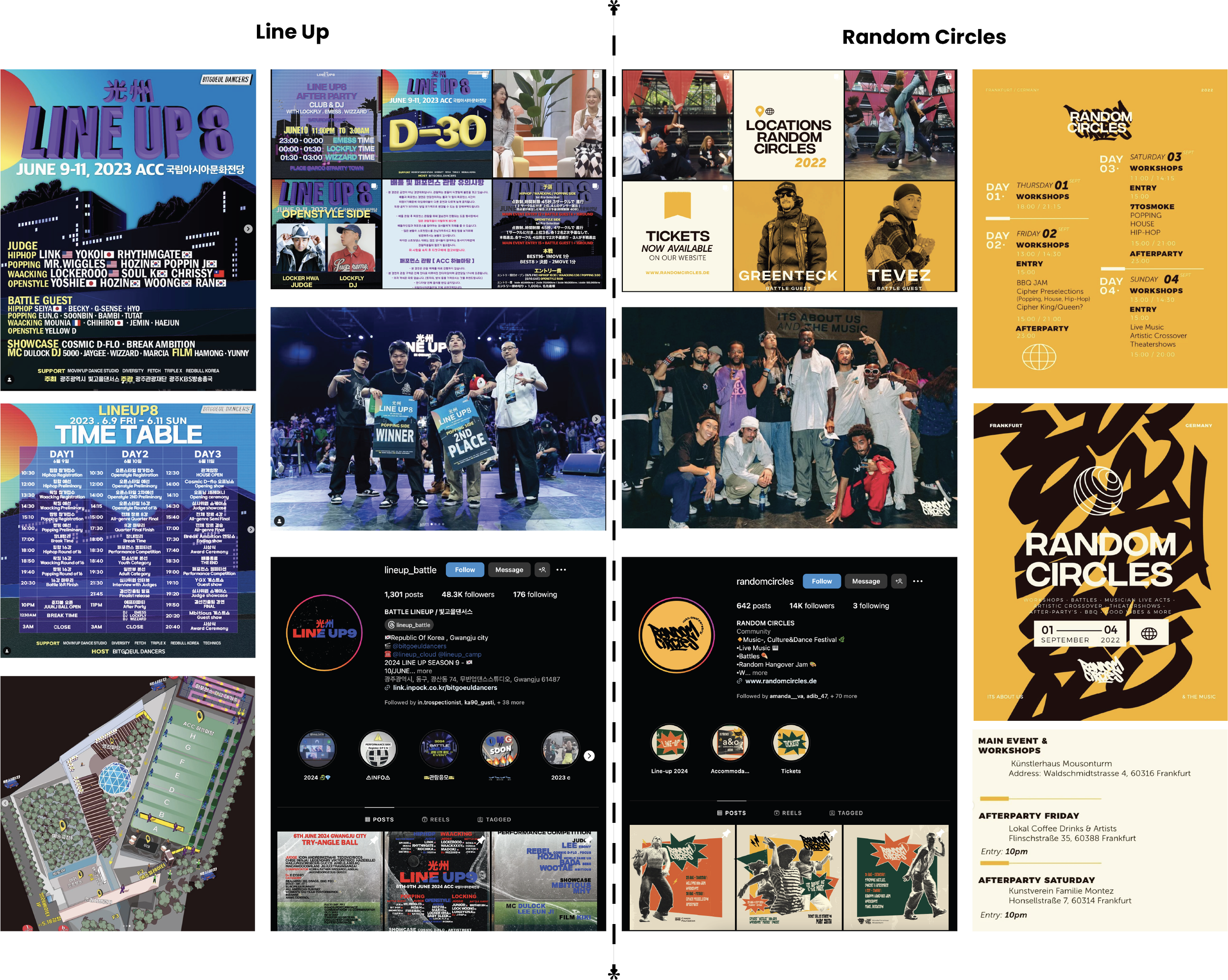 To kick off the branding process for Destructive Steps, I began by analyzing successful dance event posters on social media. My criteria for success included clear information conveyance, strong integration of Hip Hop culture and knowledge, and high event turnout in both past and current editions. I focused primarily on two internationally renowned street dance events: Random Circles (Germany) and Line Up (Korea).