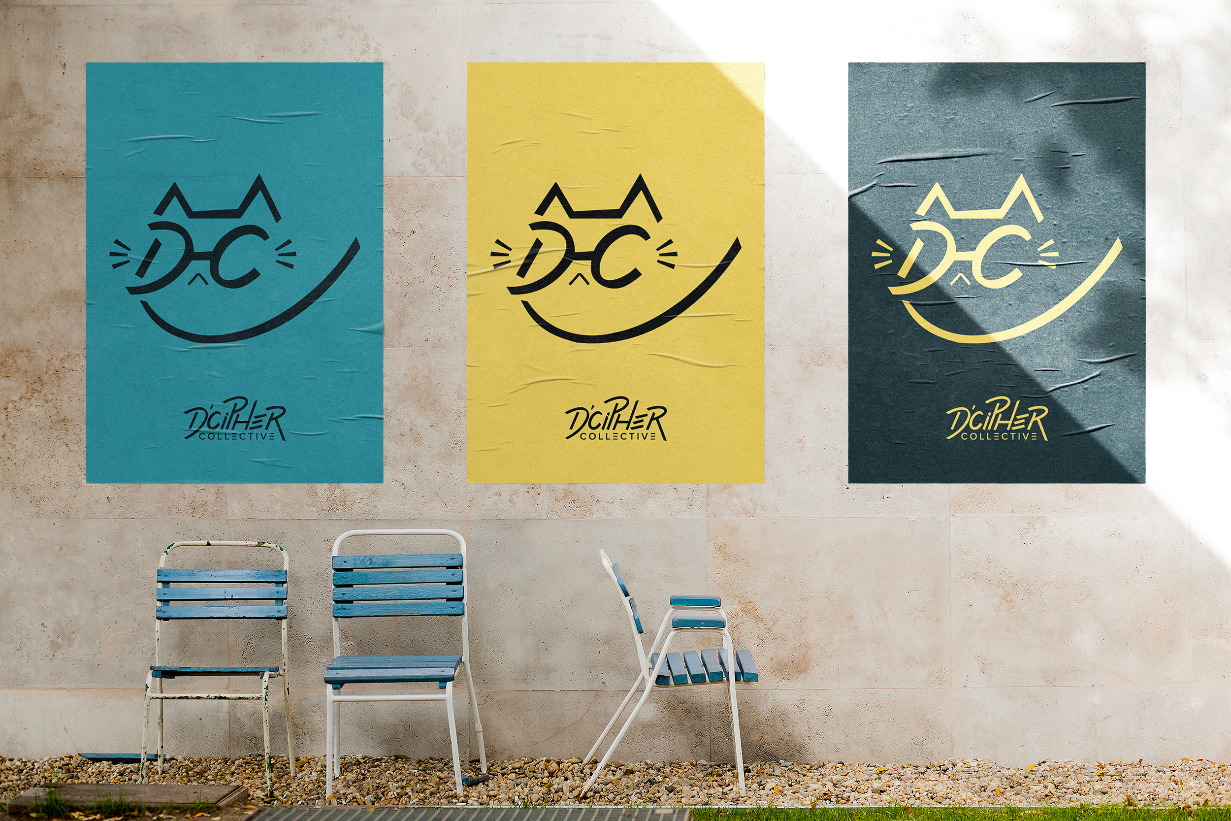 I experimented with the sizes of the words 'D’Cipher' and 'Collective.' Initially, I wanted them to blend together like "New York," but it felt too long and cluttered. Instead, I decided to make 'D’Cipher' more prominent, placing 'Collective' underneath it while ensuring both words worked together in a cohesive and unified manner.